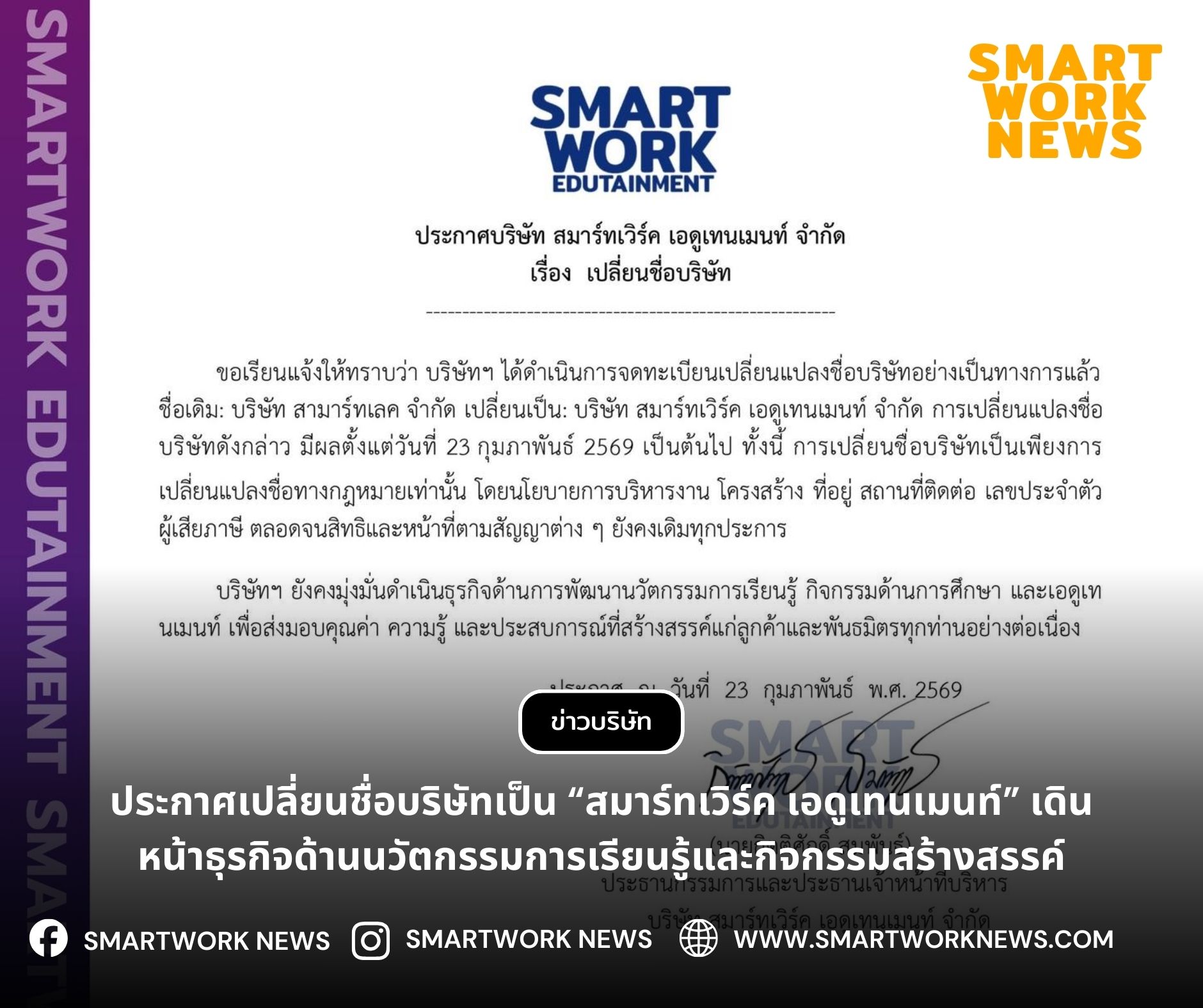 ประกาศเปลี่ยนชื่อบริษัทเป็น “สมาร์ทเวิร์ค เอดูเทนเมนท์” เดินหน้าธุรกิจด้านนวัตกรรมการเรียนรู้และกิจกรรมสร้างสรรค์